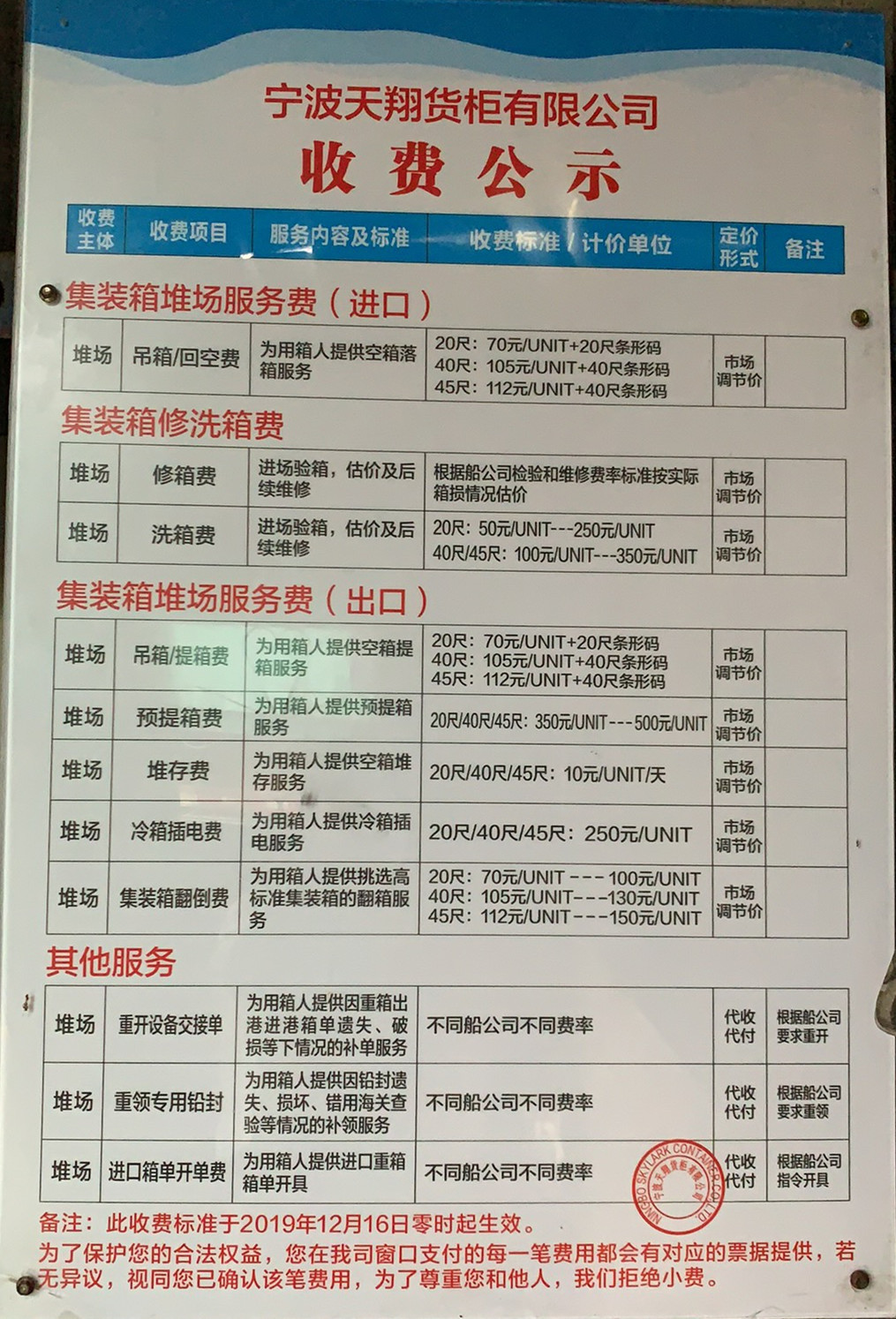 寧波天翔貨柜有限公司收費公示